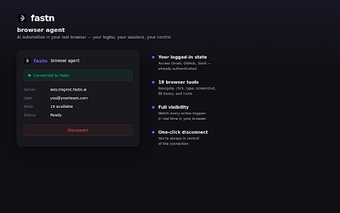 Fastn Browser Agent, tarayıcınızda günlük görevleri otomatikleştiren bir yapay zeka destekli uzantıdır. Form doldurma, sayfalar arasında gezinme ve içerik okuma gibi işlemleri kolaylaştırır. Mevcut oturumlarınızda çalışarak, kullanıcıların tam kontrolünü elden bırakmaz. Uzantı, Fastn iş alanınıza bağlanarak talimatlar alır ve tüm eylemler tarayıcınızda görünür şekilde gerçekleşir, böylece arka planda gizli bir işlem yapılmaz.